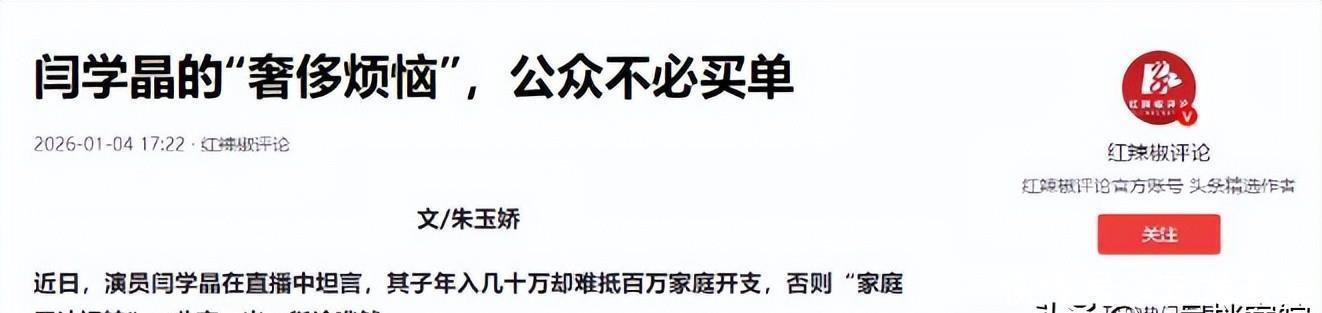 奢侈风波升级!官媒出手锐评,韩红因一个举动口碑暴增,闫学晶为张狂付出代价。明星也哭穷闫学晶在很多人眼里也是一位老艺术家了,在圈内也闯荡了很多年,按理说这样的一位大明星该是不会为了钱而犯愁,有意思的是,闫学晶却在直播间里“哭穷”,透露出自己的儿子一部戏在只能赚几十万,而一年一家的花费怎么也需要百万,孩子压力大,
